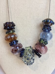 After 35 years as a physical therapist, Betsy Fallon began working full-time as a glass artist in 1997. She creates one of a kind jewelry and functional objects using her own handmade beads, silver, pearls and semi-precious stones. Fallon is fascinated with the glass process: the ability to alter the material through the use of heat and the endless color combinations. The medium of glass is a lifelong journey of possibilities, as is life itself. She has studied with national and internationally recognized bead makers.
