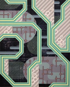 This year, five artists present works in painting, sculpture, and mixed media, all somewhat centered around an abstract theme. Julie Friedman’s paintings take visual cues from nostalgic media images. Paula Izydorek offers abstract compositions in acrylic on birch panels. Mark Keffer’s paintings address themes of uncertainty with forms reminiscent of circuitry. Alessandro Ravagnan presents sculptural membranes in mylar. In his Migrantes, Dante Rodriguez creates human/animal hybrid figures.