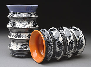 Elaine Lamb is a full time artist and owner of Mud Mothers Pottery. She has studied pottery at Akron University, the Penland School of Crafts and the Cleveland Institute of Art. Her work has been shown in juried art shows throughout the United States. Elaine’s pottery on display here is wheel thrown and hand built porcelain with sgraffito designs and silk screen transfers.