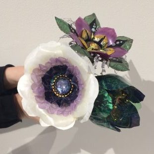 “Although inspired by nature, I particularly like finding abstract patterns like weathered pine trunks or twigs collected in a stream,” says self-taught artist and Cleveland resident Barbara Claas. “I enjoy turning natural materials and human artifacts into jewelry or art, which led to the current series of flowers created from recycled plastic bottles and caps.”