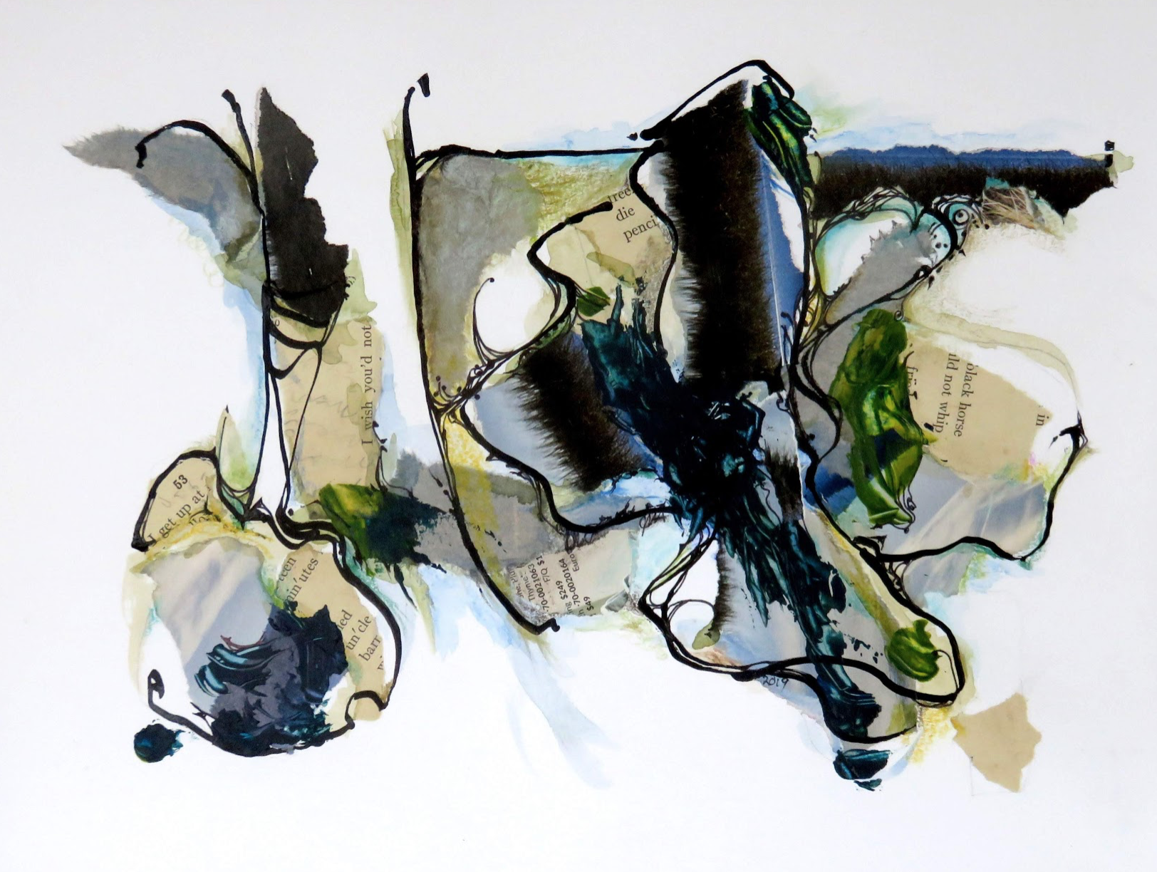 Jean Hoffman, Artist: Jean Hoffman works in mixed media creating abstract images in ink, acrylics, watercolor, pencil and collage that capture mental landscapes influenced by nature and family history with a touch of whimsy.