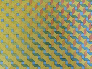 Although I am best known for leading Heights Arts for thirteen years, previously I exhibited my original hand-dyed quilts locally and nationally. Simultaneously I painted designs impossible to produce in the fabric as I explored pattern. In looking back at my work of almost forty years ago, I impressed myself and decided to bring these paintings into the public eye.